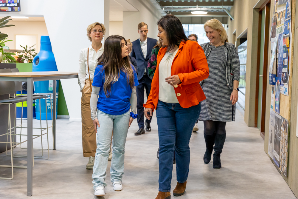 Student Shad geeft minister Mariëlle Paul een rondleiding tijdens de Girls’ Day
