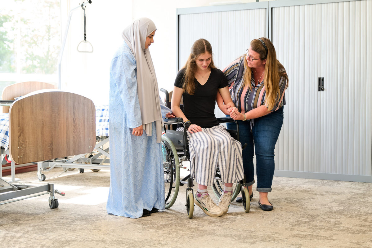 MBO-studenten Maatschappelijke zorg tijdens een praktijkles helpen mede-student uit een rolstoel