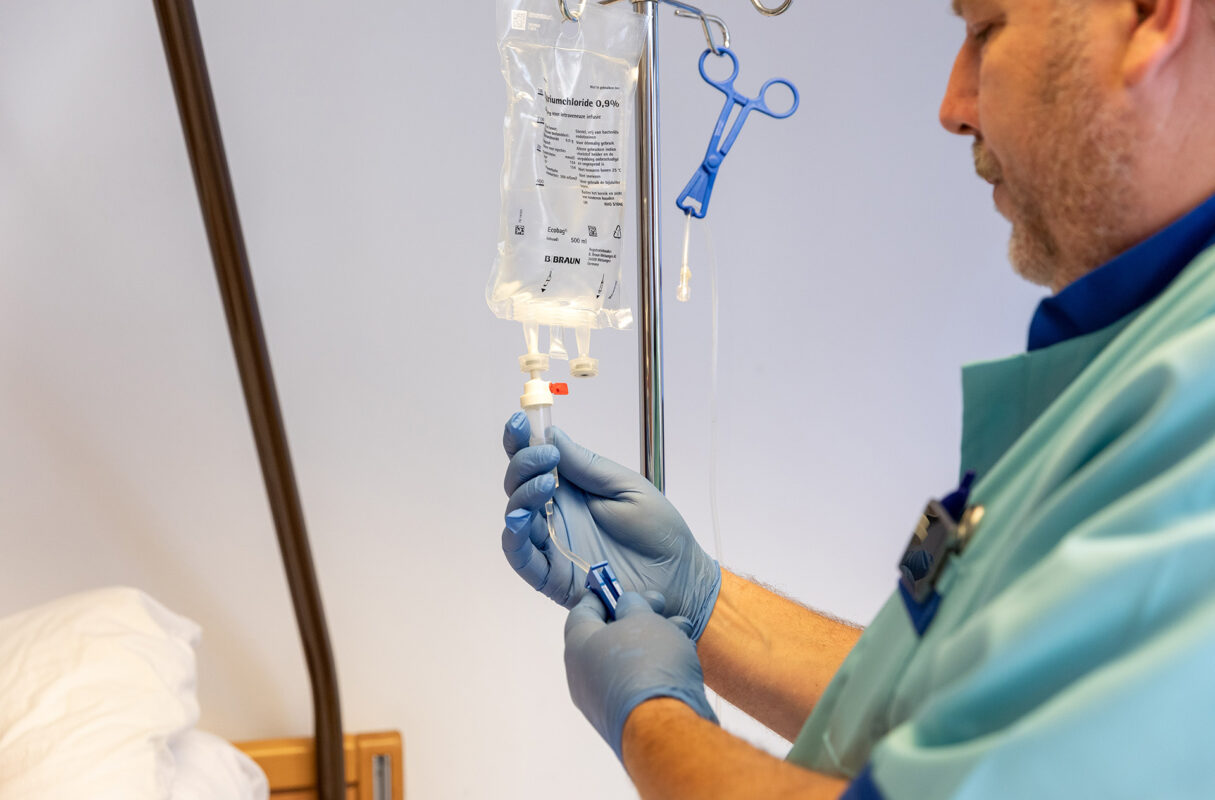 Student Verpleegkundige volwassenenonderwijs in een praktijksetting oefent met infuus